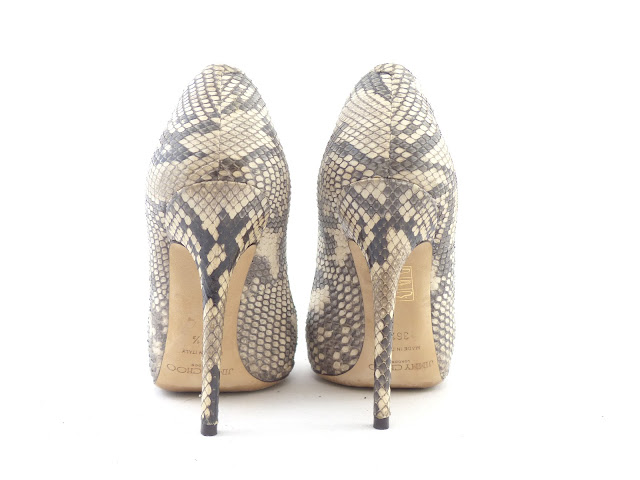 " Jimmy Choo's signature iconic stilettos are reworked for the season in washed shiny python. Heel measures 120mm/4.7."